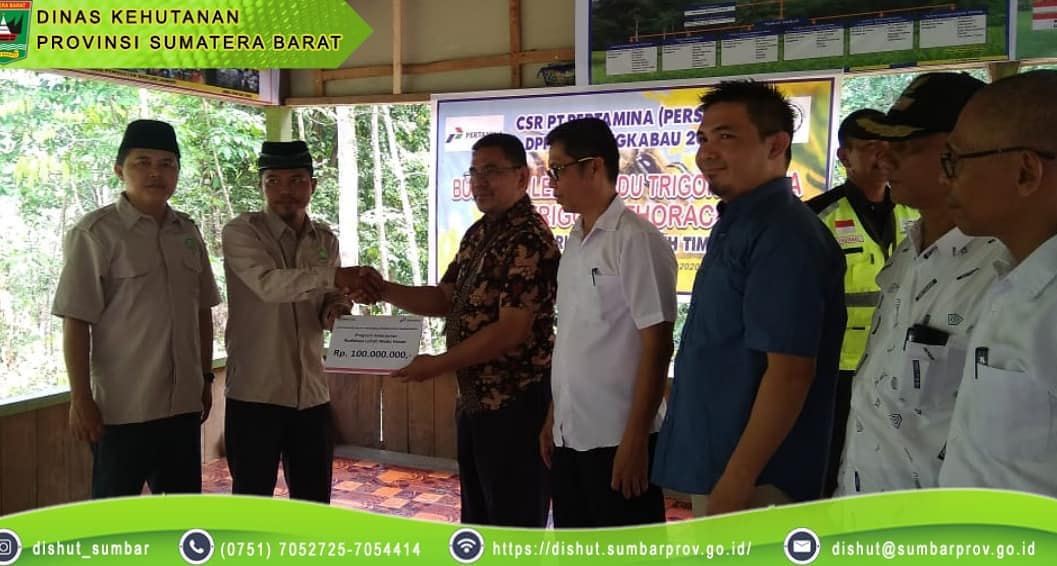 Penyerahan bantuan secara simbolis oleh Office Head DPPU PT Pertamina. Juga dihadiri oleh Camat Batang Anai, Dinas Kehutanan Prov Sumbar, Ka Resor Pariaman KPHL Bukit Barisan, Wali Nagari, Penyuluh Kehutanan dan beberapa anggota LPHN Sungai Buluah. Sungai Buluah. 5.2.2020 (ttp).