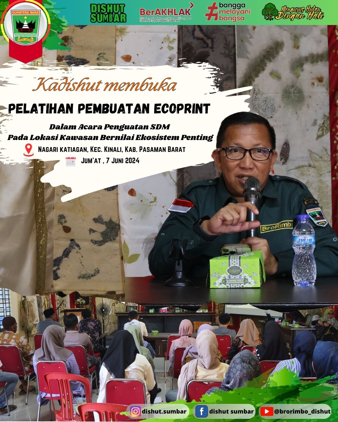 Kepala Dinas Kehutanan membuka Kegiatan Pelatihan Pembuatan Batik Ecoprint dalam Penguatan Sumber Daya Manusia Pada Lokasi Kawasan Bernilai Ekosistem Penting di Nagari Katiagan, Kec. Kinali, Kab. Pasaman Barat. Kegiatan tersebut berlangsung selama 2 hari pada Tanggal 7-8 Juni 2024 yang dilaksanakan di Aula Kantor Pemerintahan Nagari Katiagan. Turut dihadiri oleh Kepala Bidang PHKSDAE, Kepala UPTD KPHL Pasaman Raya, Wali Nagari Katiagan dan KKI Warsi.